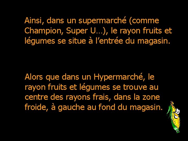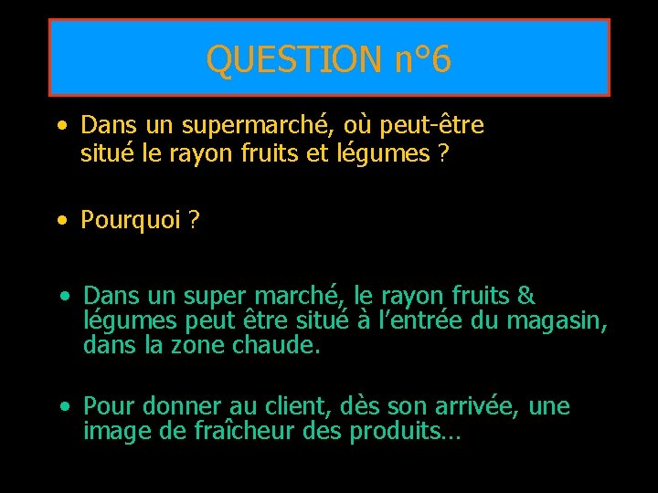 QUESTION n° 5 • Dans un hypermarché, à quel endroit est situé le rayon fruits et légumes ? • Dans un hyper marché, le rayon fruits et légumes est situé avec les rayons frais, au fond du magasin à gauche, dans la zone froide.