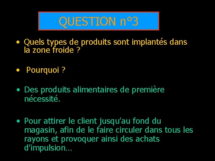 QUESTION n° 3 • Quels types de produits sont implantés dans la zone froide ? • Pourquoi ? • Des produits alimentaires de première nécessité. • Pour attirer le client jusqu’au fond du magasin, afin de le faire circuler dans tous les rayons et provoquer ainsi des achats d’impulsion…