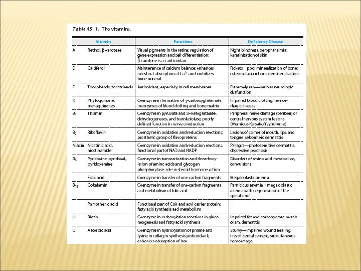 VITAMIN LARUT LIPID Vitamin larut lipid tergantung dari pencernaan dan absoprsi lipid—kasus steatorrhea dan gangguan sistem empedu defisiensi vitamin larut lipid : Buta senja dan xerophthalmia vitamin A; Rickets pada anak dan osteomalacia pada dewasa vitamin D Gangguan neurologis dan anemia neonatus vitamin E; Perdarahan neonatus vitamin K. Keracunan vitamin : intake berlebih ? ? ? ? ? vitamins A dan D Vitamin A dan β-carotene (provitamin A) atherosklerosis dan cancer prevention.