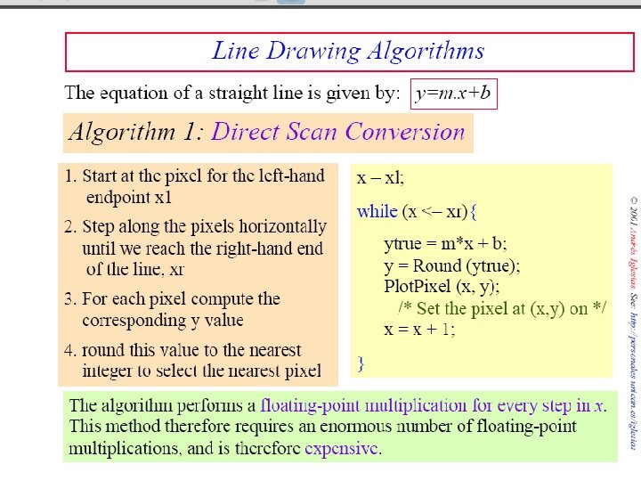 • k takes integer values starting from 1 and increases by 1 until the final point is reached. • m can be any number between 0 and 1. • Calculated y values must be rounded off to the nearest integer. • For lines with positive slope greater than 1, sample at unit y intervals (∆y = 1) and calculate each successive x value as xk+1= xk + 1/m The above eqns are based on the assumption that lines are processed from left to right. If the processing is reversed then ∆x = -1 & yk+1 = yk – m ∆y = -1 & xk+1= xk-1/m Slope >1 Slope <1