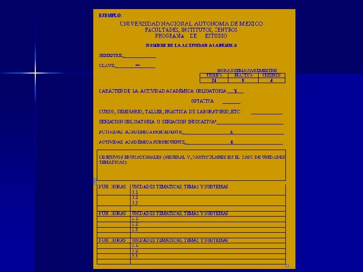 n Sugerencias didácticas (metodologías de enseñanza y aprendizaje que se utilizarán (exposición, trabajo de seminario, programa de lectura obligatoria, investigación directa, etc. ); n Forma de evaluar la eficacia de la enseñanza y el aprendizaje (exámenes, trabajos, investigaciones, participaciones, etc. ); n Perfil profesiográfico de quienes pueden impartir la actividad académica; n Bibliografía básica y bibliografía complementaria.