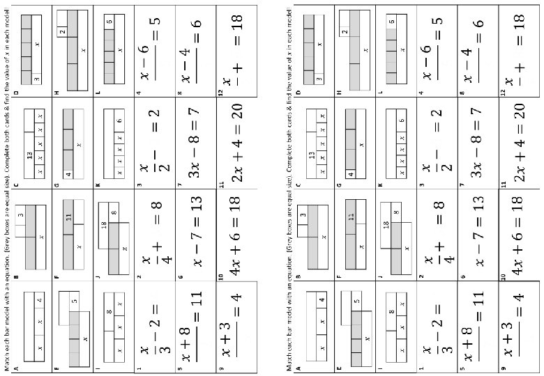 Linear Equations – Variable on One Side – 2 -Step – Non-Calculator – Card Complete & Match In this activity students work individually or in groups to match questions and answers. Instead of cutting out cards, students can letter questions and answers that go together. 3 sizes of card are included.
