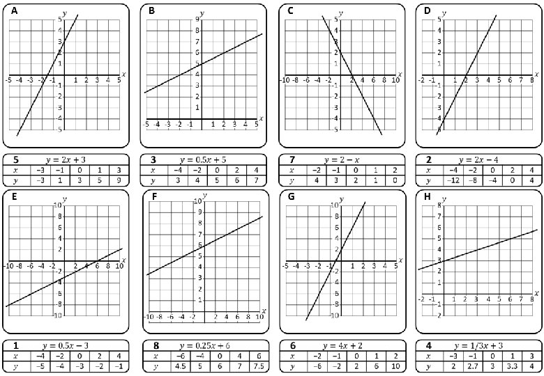 Linear Graphs – Table of Values Method – Card Complete & Match A In this activity students work individually or in groups to match questions and answers. ‘Quick Cut’ – Choose the questions/slides you wish to use and delete others. Sets of questions can then be easily guillotined to save time. One-sheet sets of cards are also included for students to cut out themselves.