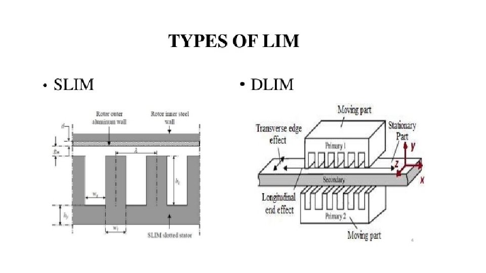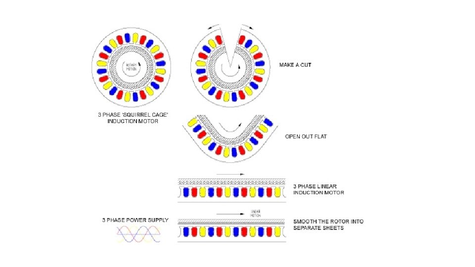 Working • Primary of a LIM is. excited by a balanced three phase power supply. • A travelling flux is induced in the primary instead of rotating three phase flux. • Electric current is induced into the secondary due to the relative motion between the traveling flux and the conductors. • This induced current interacts with the traveling flux wave to produce linear force or thrust force. • If the secondary is fixed and primary is free to move, the force will move the primary in the direction of the force, resulting in the required rectilinear motion.