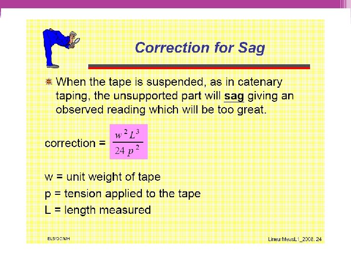 CORRECTION FOR SAG • Because of sag, the horizontal distance is less than the graduated distance between tape ends. • Can be reduced by applying greater tension but not eliminated unless the tape is supported throughout. • Eliminated by ▫ Supporting the tape at short intervals or throughout ▫ Computing the sag correction