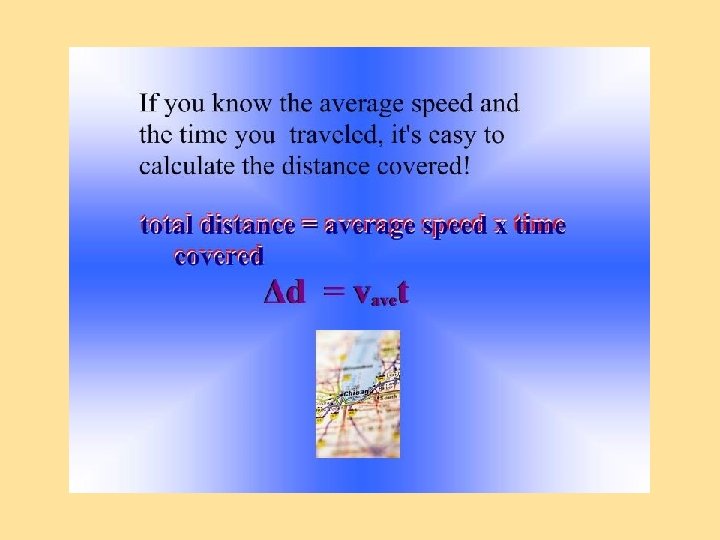 Δx = vavet Δ delta means change in x = distance (m) v = average velocity (m/s) t = time (s)