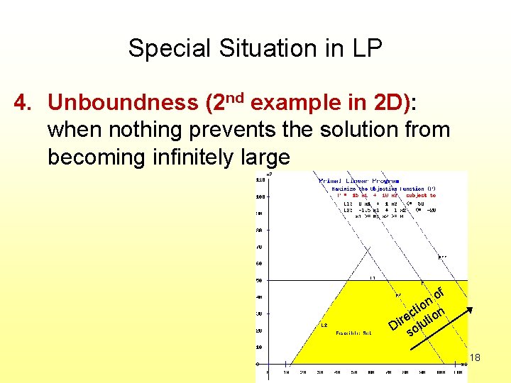 Special Situation in LP 4. Unboundness: when nothing prevents the solution from becoming infinitely large Subject to: 2 T + 3 C > 6 T, C > 0 Di of rec so tio lut n ion Max 2 T + 2 C C 2 1 0 0 1 2 3 T 17