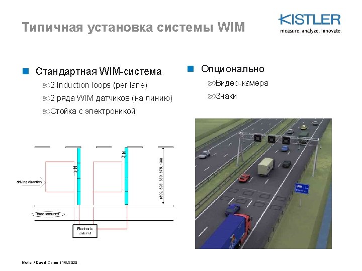 WIM Applications with Lineas n Сбор данных Анализ покрытия дороги Анализ движения (статистика) n Требования о соблюдении весового лимита Предварительный отбор Automatic enforcement (in development) Bridge protection n Tolling Shadow Tolling Toll based on weight n Traffic Management Kistler / David Cornu 11/5/2020