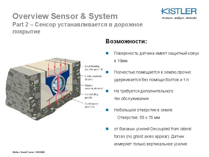 Installation Резюме: n Вы сможете установить линейки очень просто и быстро n Очень маленькое отверстие: всего лишь 55 мм в глубину и 72 мм в ширину n Traffic lane closed for only a few hours (6. . . 8 hours) n The only heavy machinery needed is a pavement cutter or milling machine n Kistler trains and supervises the installation engineers until they are ready for Kistler certification Kistler / David Cornu 11/5/2020