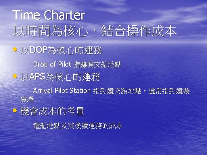 執行運務階段 post fixture • 發通告通知船長運務需知 • • • sailing instruction 監督運務進行 核算裝貨數量 stowage plan 航次結算 Laytime calculation Hire calculation