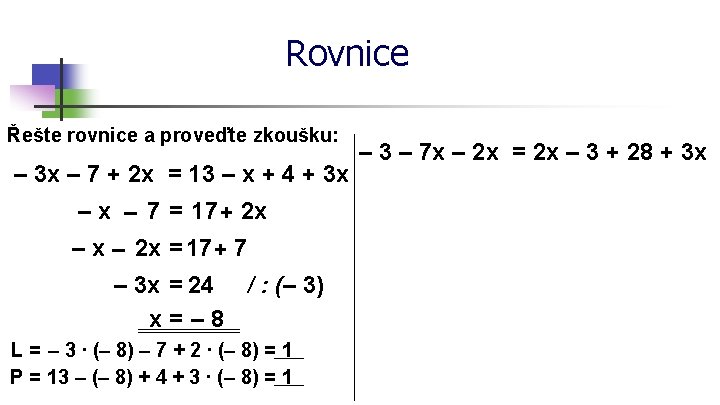 Rovnice Řešte rovnice a proveďte zkoušku: – 3(2 x – 7) = 13 + 4(2 + 3 x) – 6 x + 21 = 13 + 8 + 12 x – 6 x – 12 x = 13 + 8 – 21 – 18 x = 0 x= 0 L = – 3 (2 ∙ 0 – 7) = 21 P = 13 + 4(2 + 3 ∙ 0) = 21 / : (– 18) x=– 2 5(7 x – 3) = 2(9 x – 8) – 3(5 – 3 x)
