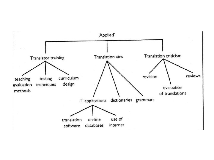 Names for the discipline • • • The art of translation The craft of translation The science of translation The theory of translating The theory of translation The philosophy of translation Translation theory Translatology / Traduttologia / Traductologie Translation Studies