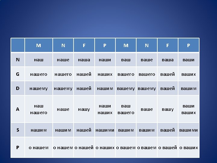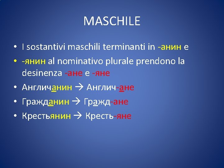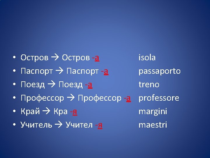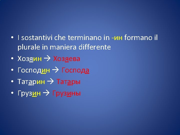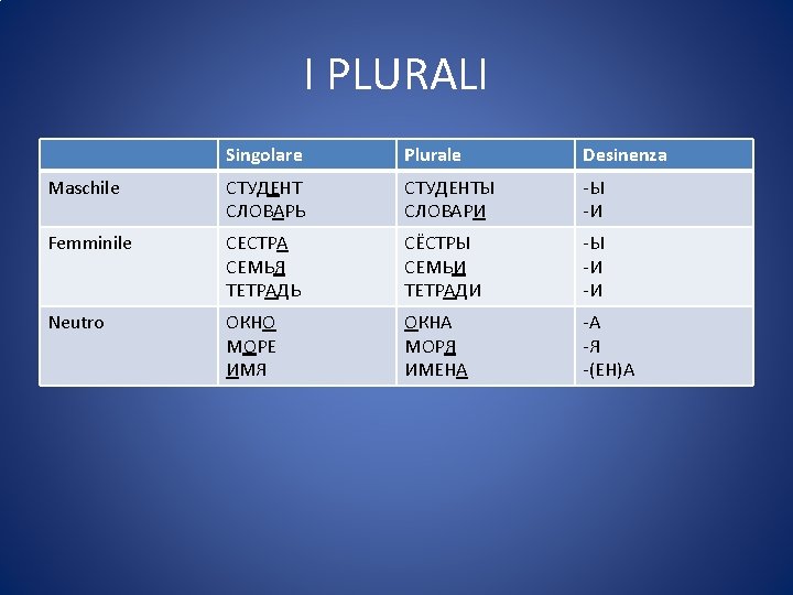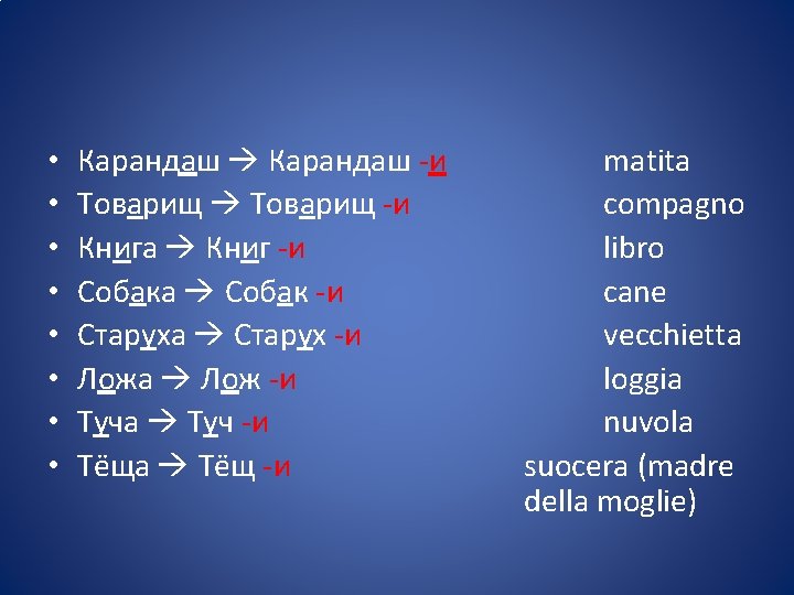 • Ковёр Ковры • Церковь Церкви tappeto chiesa • Molti sostantivi maschili, invece, prendono le desinenze -а/-я toniche • Адрес -а indirizzo • Берег -а riva • Вечер -а sera
