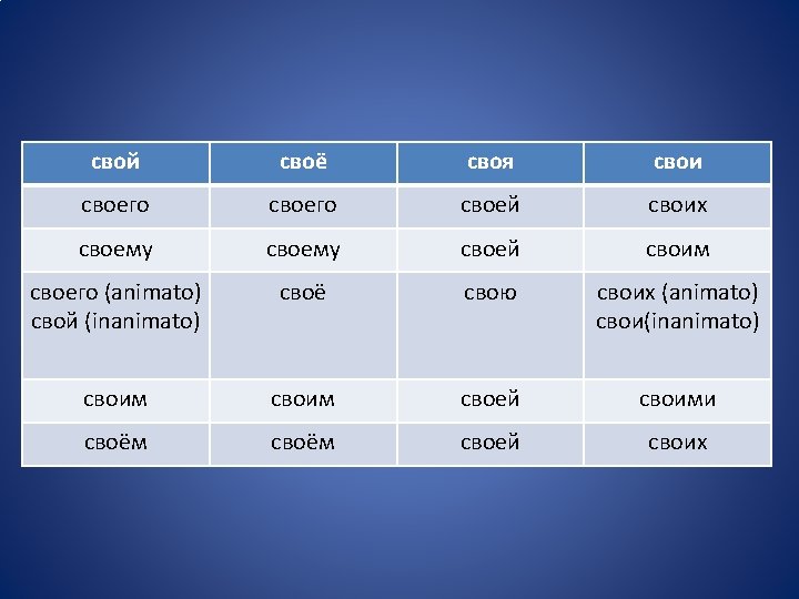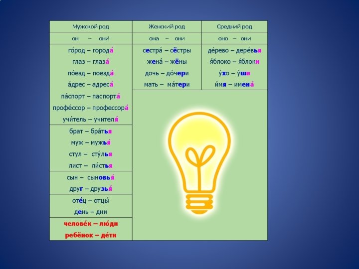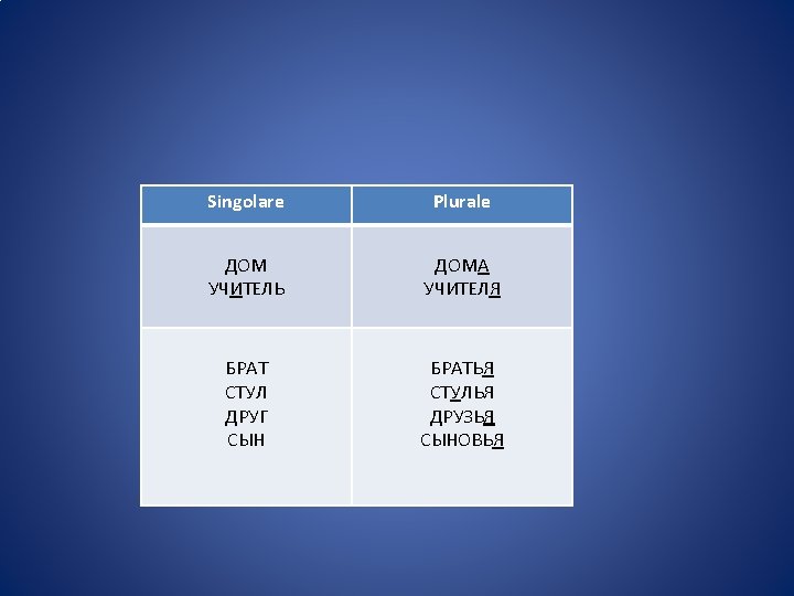 • Alcuni sostantivi maschili e neutri al plurale hanno la desinenza -ья • Брат -ья fratello • Лист -ья foglia • Стул -ья sedia • Крыло Крыл-ья ala • Перо Пер-ья penna • Дерево Дерев -ья albero