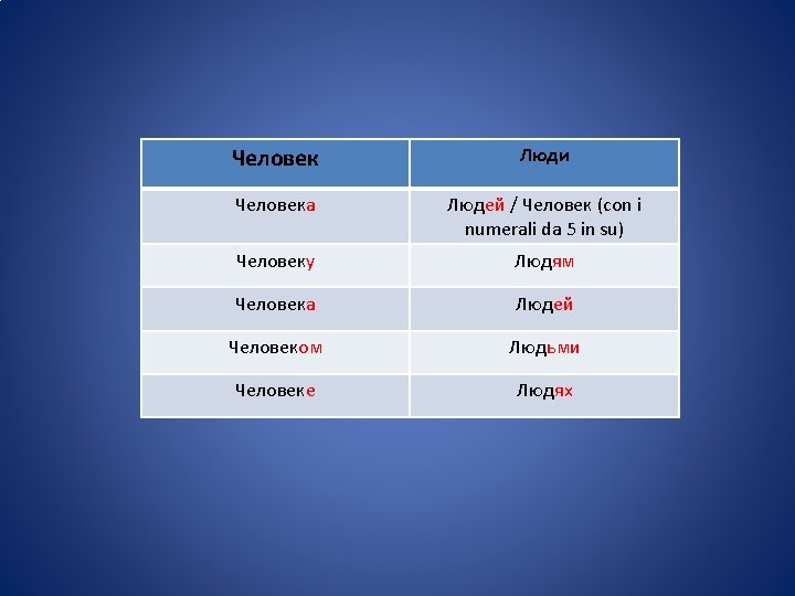 • • • Il plurale di цветок (fiore) è цветы На лугу запестрели цветы Invece, il plurale di цвет (colore) è цвета Я люблю яркие цвета Il plurale di человек è люди Con i numeri ordinali che reggono il genitivo plurale si usa la forma человек