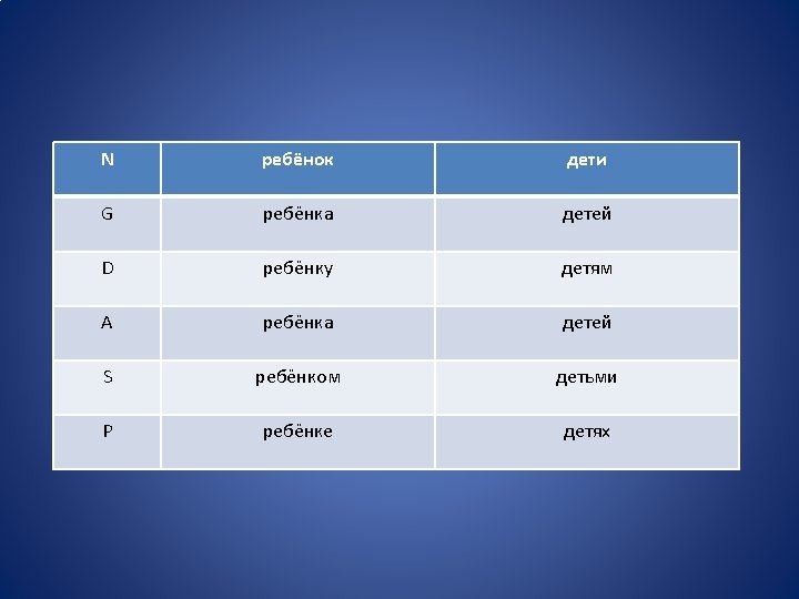 • Segue lo stesso criterio la parola ребёнок, il cui plurale è *ребята. Tuttavia, la forma più comunemente usata è дети.