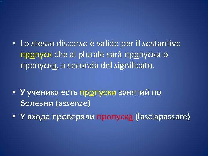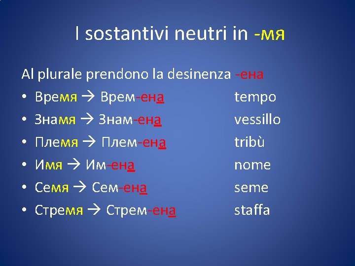 • Invece alcune parole non vengono usate al plurale • Бремя fardello • Вымя mammella • Пламя fiamma • Темя sincipite
