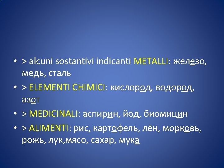 • > Sostantivi astratti formatisi da aggettivi o verbi • Молодость la giovinezza • Белизна il candore • Темнота l’oscurità • Внимание l’attenzione