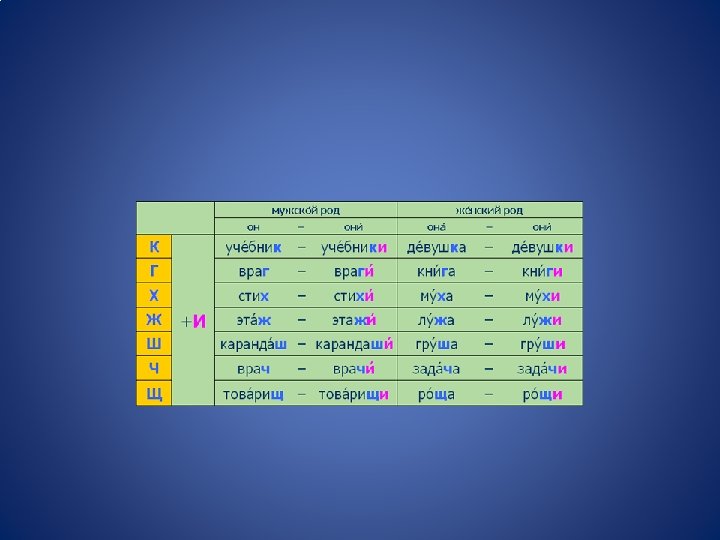 • I sostantivi maschili e femminili con tema che termina in -г, -к, -х e -ж, -ч, -ш, -щ prendono la desinenza -и • Враг -и nemico • Мальчик -и ragazzo • Стих –и verso • Нож -и coltello • Врач -и medico
