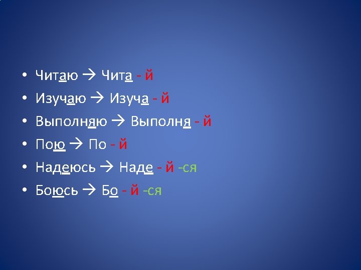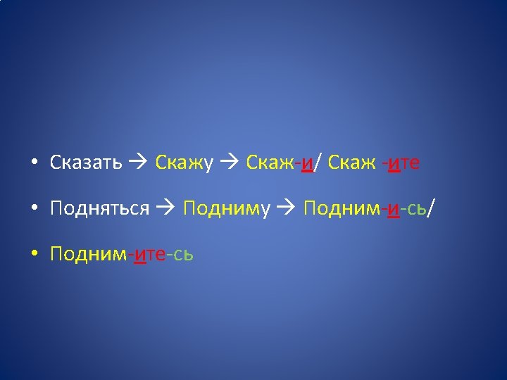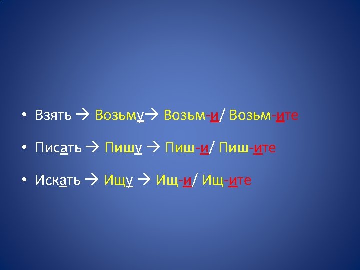 • Se a questi verbi viene aggiunto il prefisso tonico вы- il loro imperativo manterrà la desinenza - и, nonostante il fatto che l’accento cada sul prefisso вы-. • Выиду выиди • Выскажу выскажи • Выучу выучи