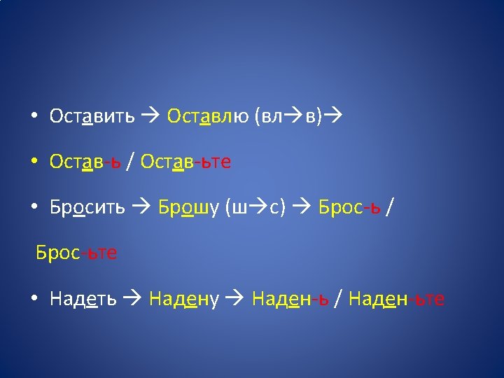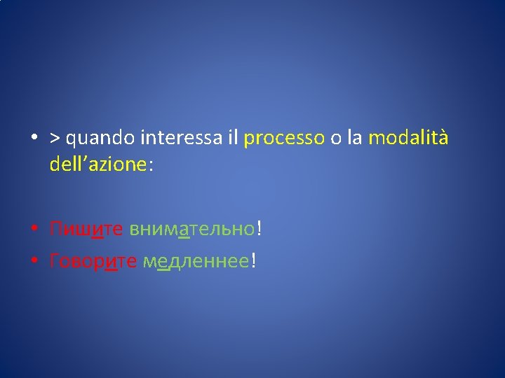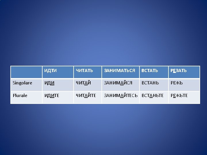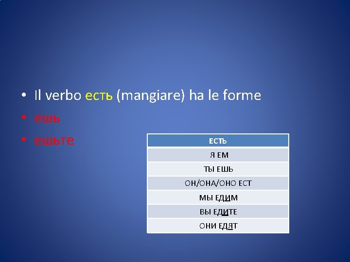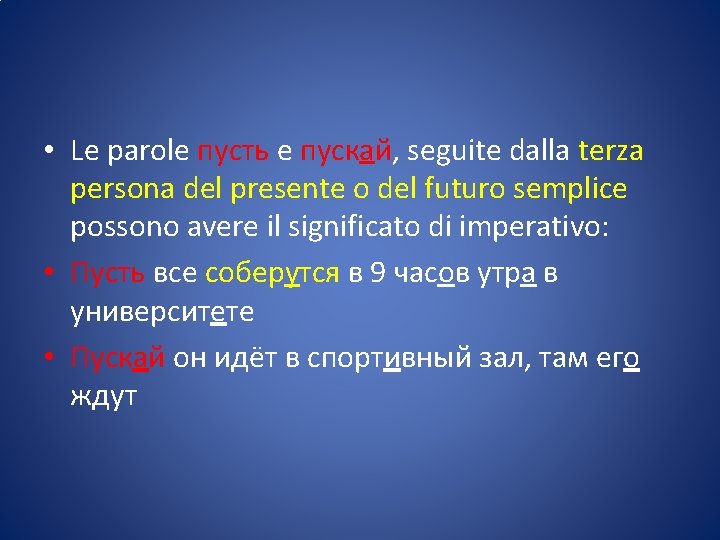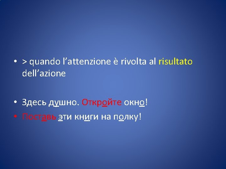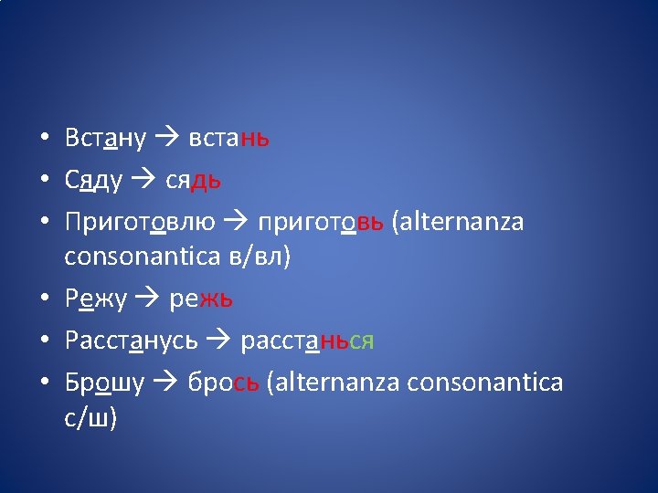 • Più semplicemente: • > Dopo CONSONANTE, se l’accento cade sul tema (desinenza atona), aggiungiamo -ь/-ьте • Встать Встану Встан-ь /Встан-ьте • Сесть Сяду Сяд-ь / Сяд-ьте