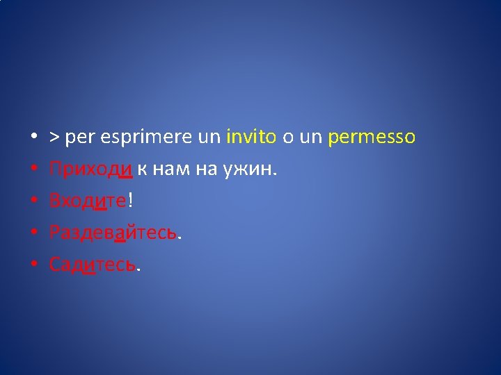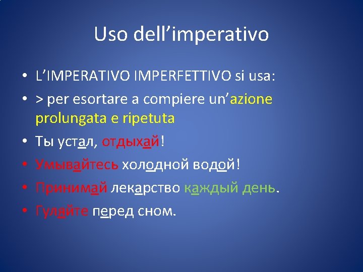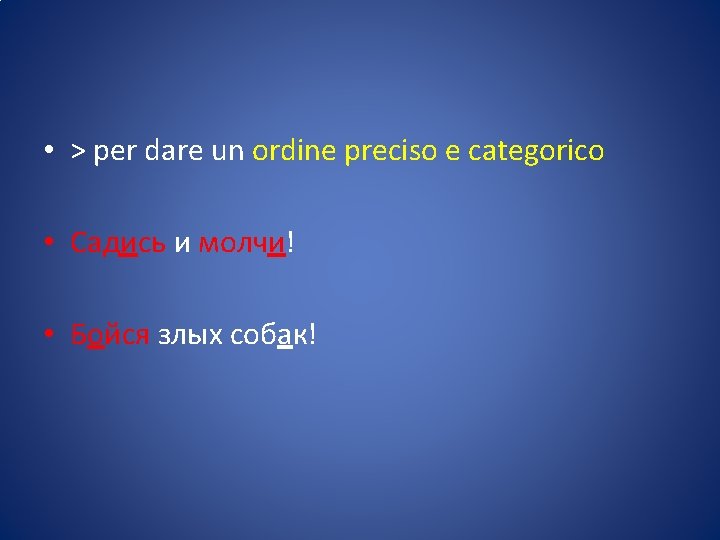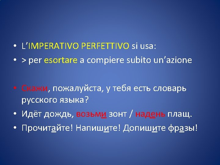 • L’imperativo (повелительное наклонение велить-повелить: ordinare ) è il modo usato per impartire ordini, esprimere esortazioni o fare richieste.
