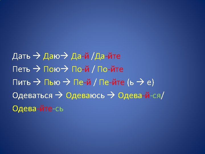 • I verbi monosillabici con -и nel tema dell’infinito hanno l’imperativo terminante in -й • Пить пью пей • Лить лью лей • Бить бью бей