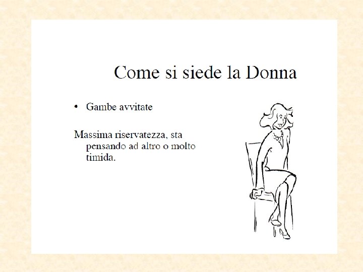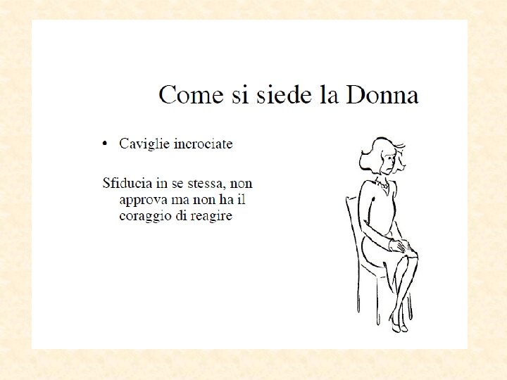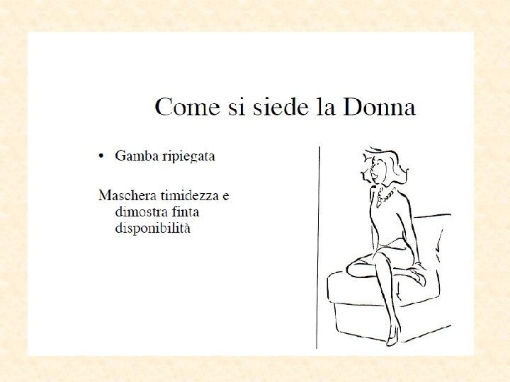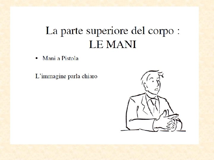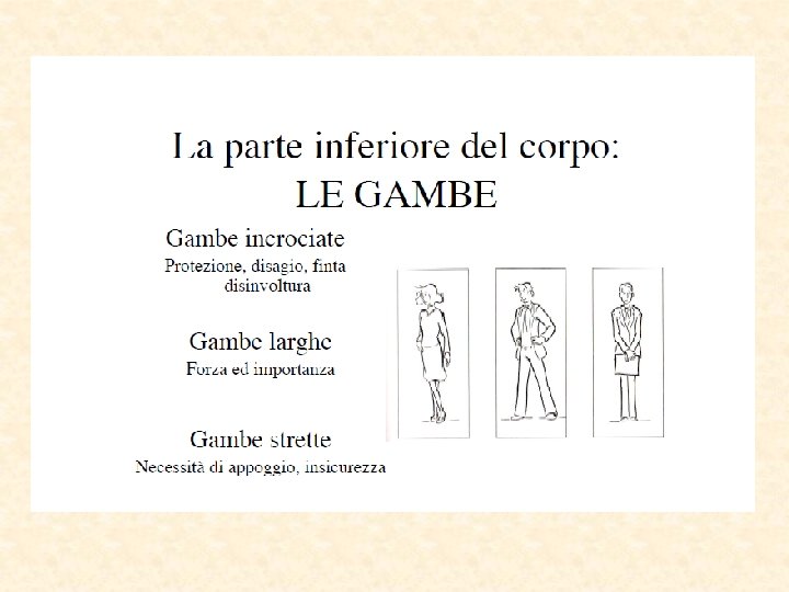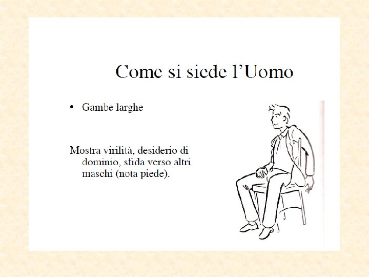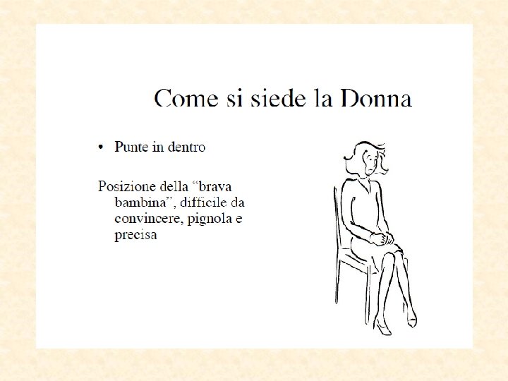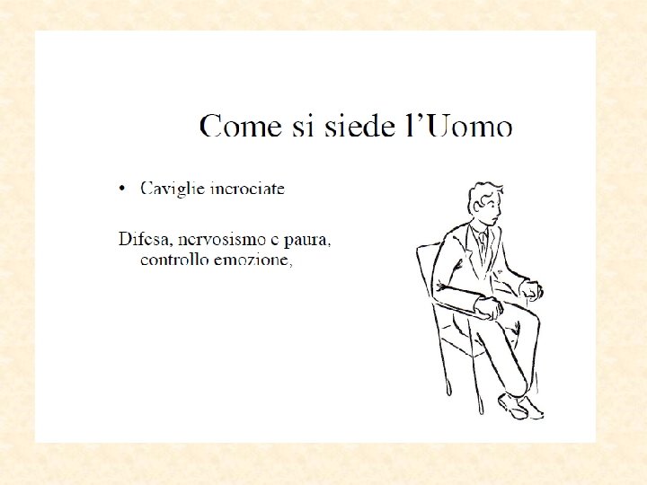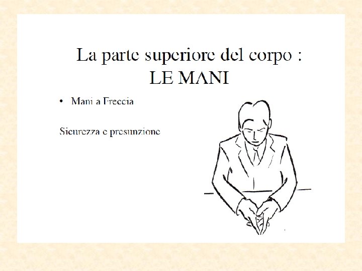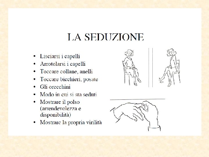 Parti del corpo “sincere” Piedi puntano nella direzione del pensiero Occhi la pupilla si dilata Eccitamento sessuale Paura Parti più lontane dal cervello Inconsciamente “invisibili” Direzione del reale desiderio