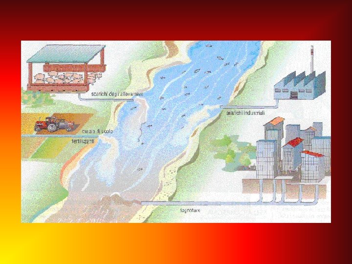 CAUSE DELL'INQUINAMENTO scarichi industriali contengono una grande quantità di inquinanti e la loro composizione varia a secondo del tipo di processo produttivo. Il loro impatto sull'ambiente è complesso: spesso le sostanze tossiche contenute in questi scarichi rinforzano reciprocamente i propri effetti dannosi e quindi il danno complessivo risulta maggiore della somma dei singoli effetti. I fertilizzanti chimici usati in agricoltura e i liquami prodotti dagli allevamenti sono ricchi di sostanze organiche che, dilavate dalla pioggia, vanno a riversarsi nelle falde acquifere o nei corpi idrici superficiali. A queste sostanze si aggiungono spesso detriti più o meno grossi, che si depositano sul fondo dei bacini. Gli