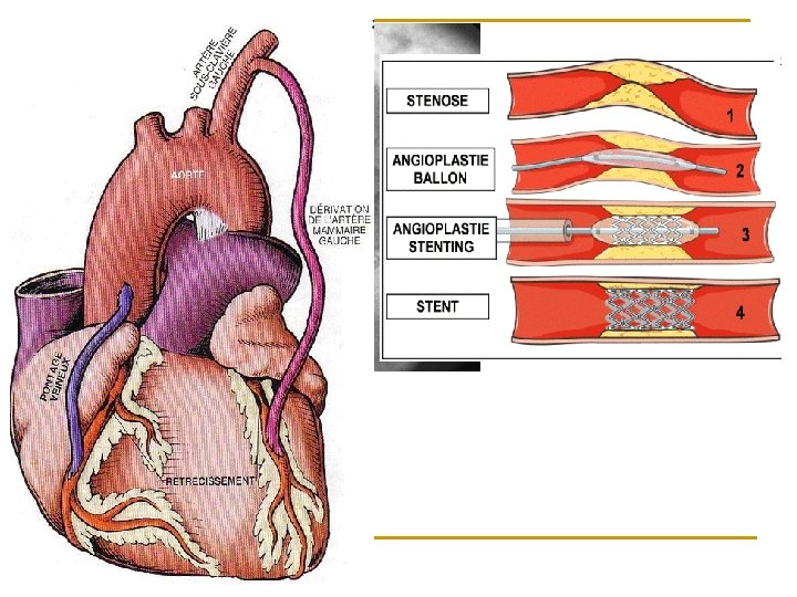 F- Traitement n Mesures hygiéno-diététiques et contrôle des facteurs de risque: manger sain et varié, régime et perte de poids pour les obèses (IMC > 25 Kg/m²), activité physique régulière, stop tabac, modération de la consommation d’alcool, bon équilibre de la TA et du diabète. n Ailleurs - Soit renforcer le traitement médicamenteux; - Soit si coronarographie: . revascularisation myocardique mécanique par angioplastie percutanée (± stent) ou chirurgicale par pontage aorto-coronaire, . sinon traitement purement médical