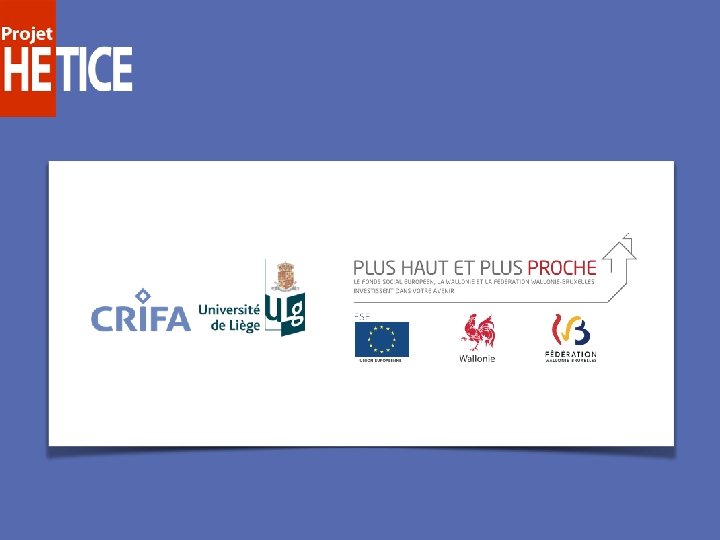 Le projet HETICE • Ce projet s’adresse aux enseignants des Hautes Écoles de la FWB • Il encourage l’utilisation critique des TIC dans leurs pratiques • Il s’articule autour de 8 actions complémentaires 01 Présentation du Proje