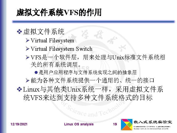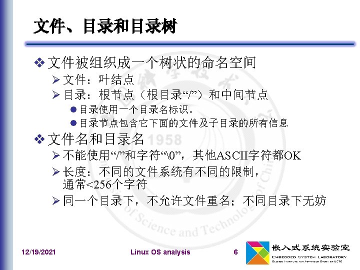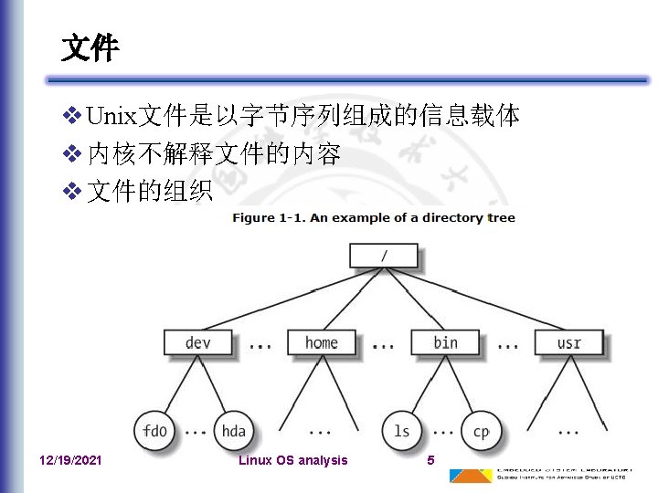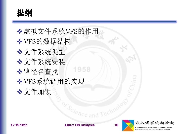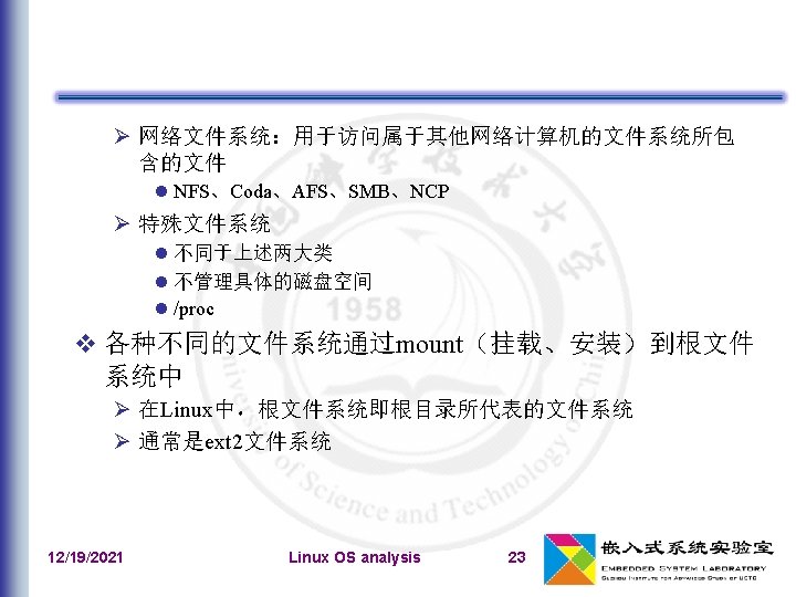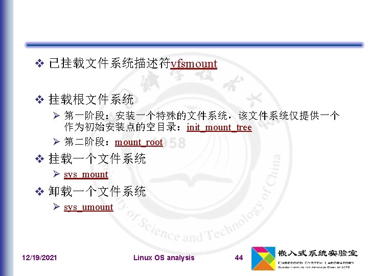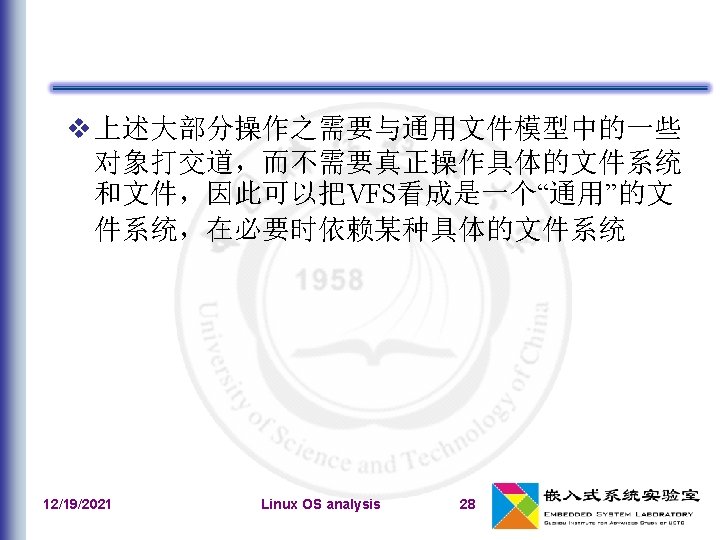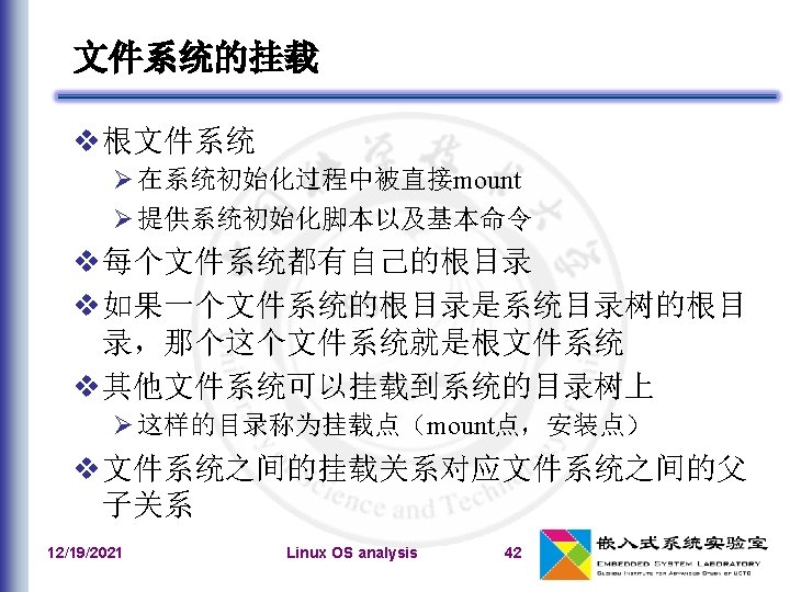 文件系统类型的注册 文件系统类型:file_system_type 在系统初始化期间,register_filesystem()用来注 册编译时指定的每个文件系统 相应的文件系统对象被插入到file_systems链表中 unregister_filesystem() 12/19/2021 Linux OS analysis 41