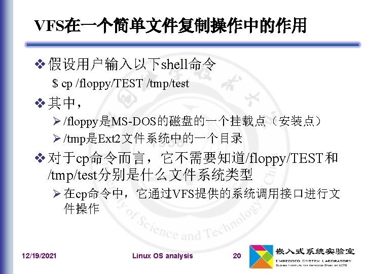 VFS系统调用的实现 仍然考虑 $ cp /floppy/TEST /tmp/test 假定cp执行下列代码片段(实际要更复杂) inf = open("/floppy/TEST", O_RDONLY, 0); outf = open("/tmp/test", O_WRONLY | O_CREAT | O_TRUNC, 0600); do { len = read(inf, buf, 4096); write(outf, buf, len); } while (len); close(outf); close(inf); 12/19/2021 Linux OS analysis 53