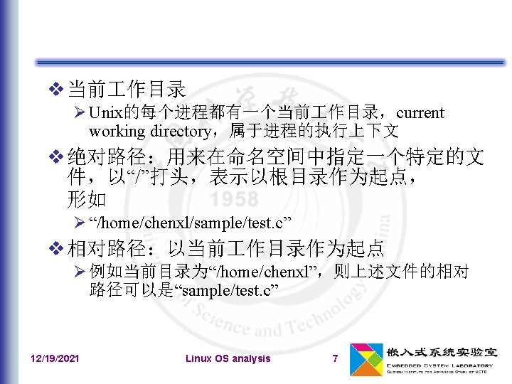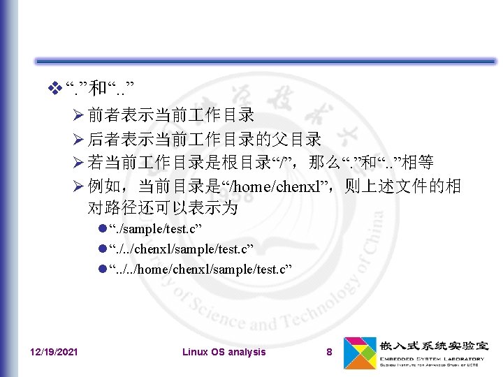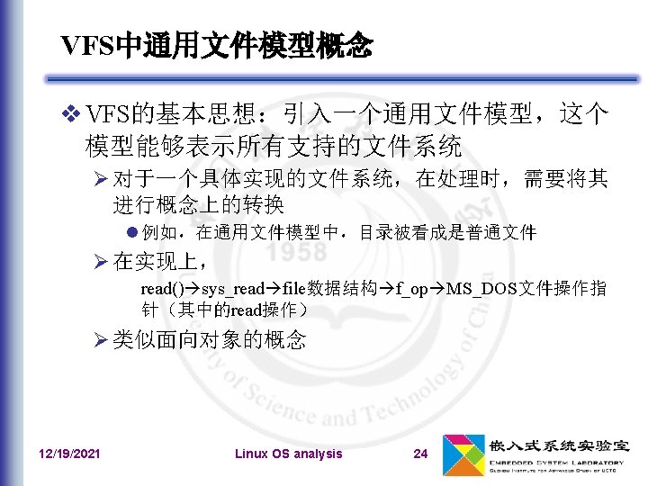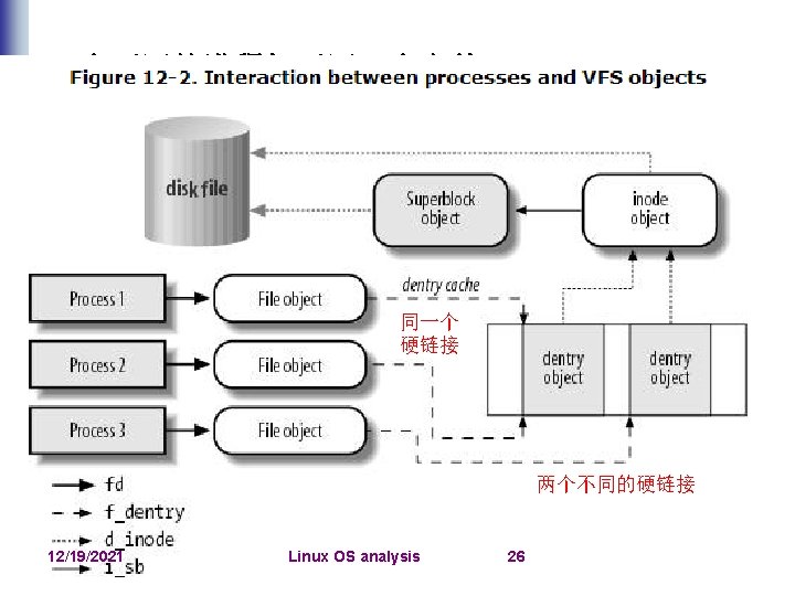 Xxx_inode_info include/linux/fs. h 一个具体的文件:Inode对象:inode Inode特有的方法 inode_operations 文件特有的方法 file_operations Vfs_inode include/linux/dcache. h 目录项对象:dentry 目录项操作:dentry_operations 一个打开文件:文件对象:file 文件操作指针f_pos 文件对象特有的方法 include/linux/fs. h 专用高速缓存:“filp”,filp_cachep 12/19/2021 Linux OS analysis 33