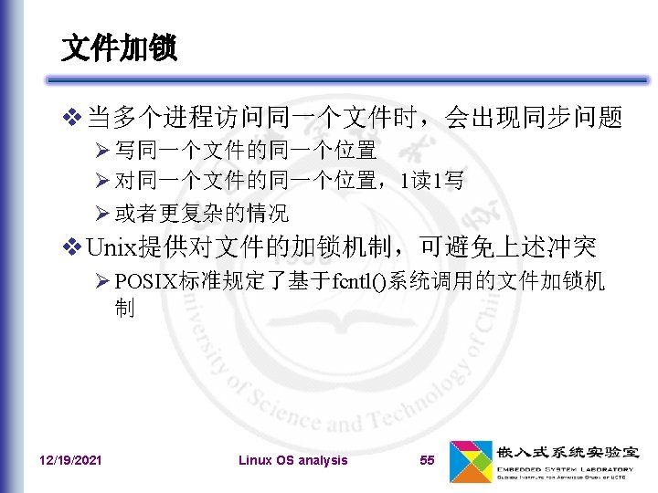 open()系统调用 sys_open read和write系统调用 sys_write sys_read close系统调用 sys_close 12/19/2021 Linux OS analysis 54