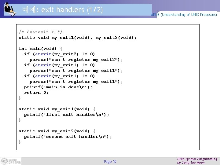 예제: exit handlers (1/2) APUE (Understanding of UNIX Processes) /* doatexit. c */ static void my_exit 1(void), my_exit 2(void); int main(void) { if (atexit(my_exit 2) != 0) perror("can't register my_exit 2"); if (atexit(my_exit 1) != 0) perror("can't register my_exit 1"); printf("main is donen"); return 0; } static void my_exit 1(void) { printf("first exit handlern"); } static void my_exit 2(void) { printf("second exit handlern"); } Page 10 UNIX System Programming by Yang-Sae Moon