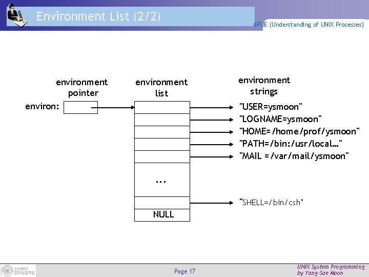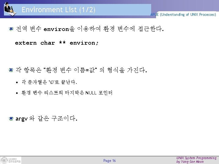 Environment Variables (2/2) Page 15 APUE (Understanding of UNIX Processes) UNIX System Programming by Yang-Sae Moon