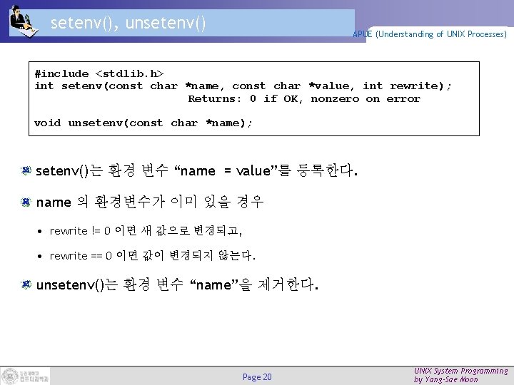 putenv() APUE (Understanding of UNIX Processes) #include <stdlib. h> int putenv(const char *str); Returns: 0 if OK, nonzero on error 환경 변수를 추가한다 str은 "name=value" 형식의 문자열 성공적으로 실행된 경우 0을 리턴 같은 이름의 환경 변수가 이미 있다면 새 값으로 변경된다 Page 19 UNIX System Programming by Yang-Sae Moon