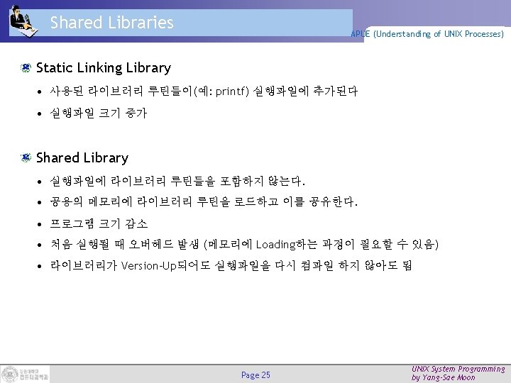 Memory Layout of a C Program (2/2) APUE (Understanding of UNIX Processes) Text Segment • Machine instructions (read-only, sharable) Initialized Data Segment • e. g. int maxcount = 99; (initialized) Uninitialized Data Segment • (bss: block started by symbol) • e. g. long sum[1000]; Stack • automatic variables, temporary variables, return address, caller's environment (registers) Heap • dynamic memory allocation (e. g. , malloc()) Page 24 UNIX System Programming by Yang-Sae Moon