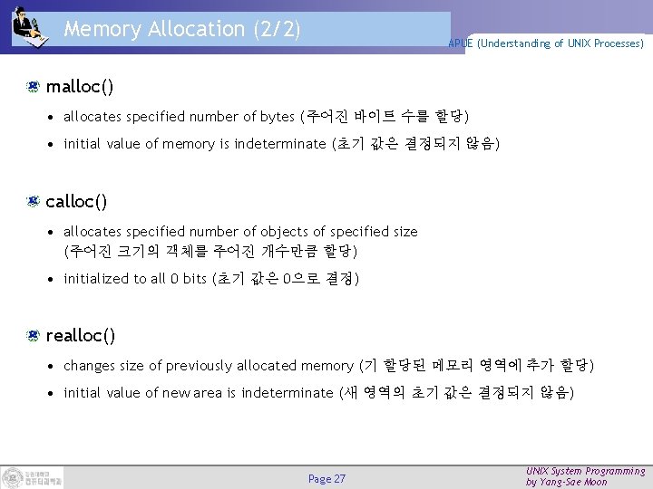 Memory Allocation (1/2) APUE (Understanding of UNIX Processes) #include <stdlib. h> void *malloc(size_t size); void *calloc(size_t nobj, size_t size); void *realloc(void *ptr, size_t newsize); returns: nonnull pointer if OK, NULL on error void free(void *ptr); Dynamic allocation of memory from heap Provide suitable alignment • ex) doubles must start at the addresses that are multiples of 8. Page 26 UNIX System Programming by Yang-Sae Moon