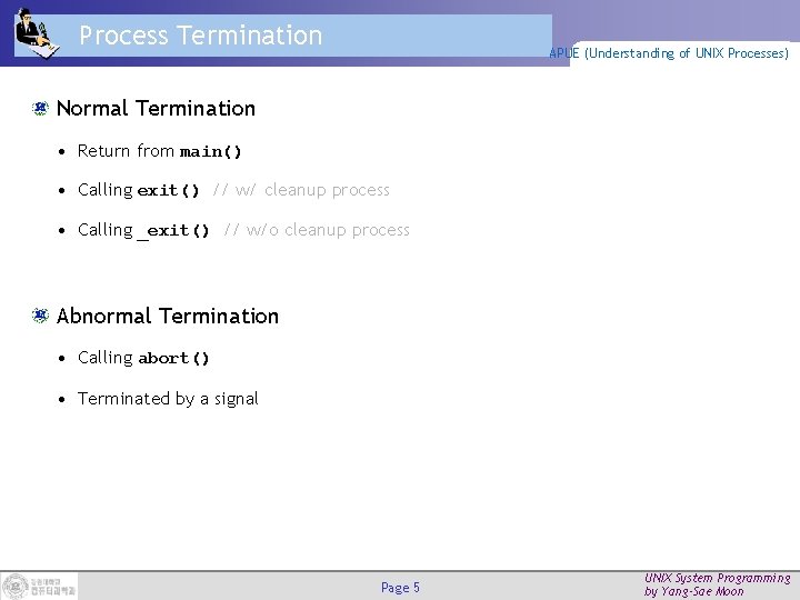 Process Termination APUE (Understanding of UNIX Processes) Normal Termination • Return from main() • Calling exit() // w/ cleanup process • Calling _exit() // w/o cleanup process Abnormal Termination • Calling abort() • Terminated by a signal Page 5 UNIX System Programming by Yang-Sae Moon