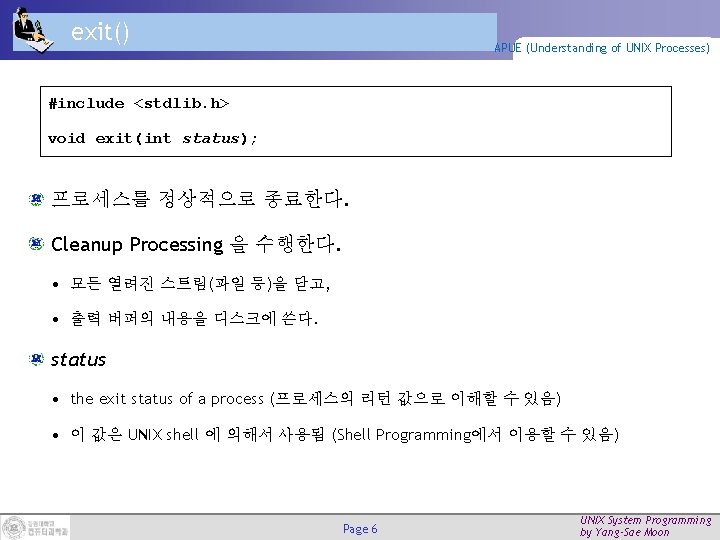 _exit() APUE (Understanding of UNIX Processes) #include <unistd. h> void _exit(int status); 프로세스를 정상적으로 종료한다. Kernel로 즉시 리턴한다. (Cleanup Processing을 수행하지 않는다. ) Page 7 UNIX System Programming by Yang-Sae Moon