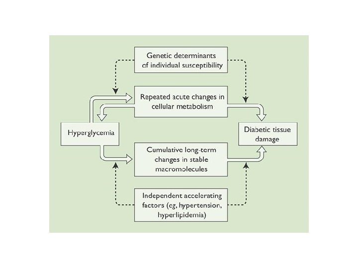 Vie metaboliche responsabili del danno da iperglicemia I. AUMENTATA FORMAZIONE DI SORBITOLO E FRUTTOSIO MEDIATA DA ALDOSIO REDUTTASI II. PRODUZIONE DI ADVANCED GLYCATION END-PRODUCTs (AGE) III. AUMENTATA PRODUZIONE DI DIACILGLICEROLO E ATTIVAZIONE DI PROTEIN CHINASI C IV. AUMENTO DELLA VIA DI FORMAZIONE DELLA ESOSAMINA