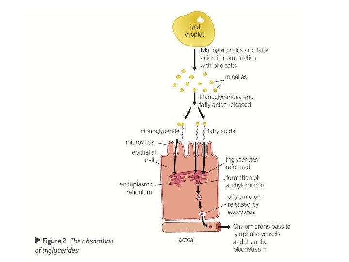 Absorption of triglycerides • Chylomicrons move out of the epithelial cells by exocytosis. • Enter lymphatic capillaries called lacteals in the centre of villi • Chylomicrons pass trough lymphatic vessels into the blood • The triglycerides are hydrolysed by an enzyme in the endothelial cells of blood capillaries from where they can diffuse into cells