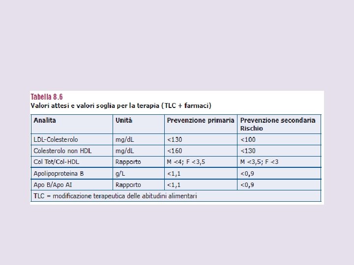 VALUTAZIONE DEL METABOLISMO LIPIDICO I parametri di laboratorio per la valutazione del metabolismo lipidico di dividono in: a) Parametri di I livello: colesterolemia e trigliceridemia b) Parametri di II livello: colesterolo LDL e colesterolo HDL c) Altri parametri (in genere riservati ad una valutazione più specialistica): ad esempio ricerca di mutazioni nel gene del recettore per le LDL