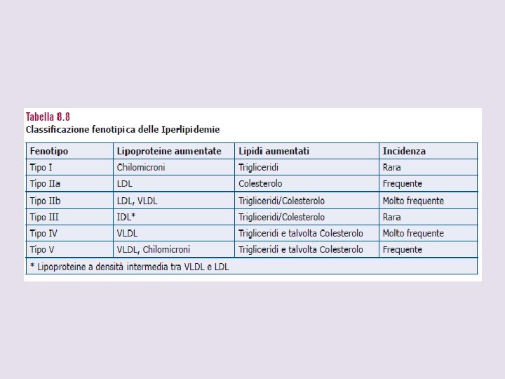 Iperlipidemie familiari Oltre alle cause acquisite di ipercolesterolemia e/o ipertrigliceridemia, vi sono alcune forme congenite, definite iperlipoproteinemie o iperlipidemie familiari, che possono essere classificate in 5 tipi: - Tipo 1, iperchilomicronemia familiare, si associa alla presenza di chilomicroni nel sangue anche dopo alcune ore dal pasto, e quindi a livelli elevati di trigliceridi (oltre 1000 mg/d. L); -dal punto di vista genetico si distinguono due forme: la prima forma è dovuta al deficit di lipoprotein lipasi la seconda forma è dovuta alla carenza di Apo CII, l’apoproteina che attiva la lipoprotein lipasi. - Tipo 2 a, ipercolesterolemia familiare, si associa all’aumento sierico di LDL e quindi di colesterolo. E’ la forma più frequente, con un’incidenza di 1: 500. -Nella maggior parte dei casi è dovuta a mutazioni nel gene codificante il recettore epatico per le LDL, che causa un ridotto ingresso di LDL e quindi di colesterolo nel fegato. - Tipo 2 b, iperlipidemia familiare combinata, si associa ad aumenti sierici sia dei trigliceridi che del colesterolo. - Tipo 3, è molto raro. Si associa ad aumenti di colesterolo e trigliceridi dovuti alla presenza di una lipoproteina anomala. - Tipo 4, ipertrigliceridemia familiare, in cui non è noto il difetto genico. - Tipo 5, associato a severa ipertrigliceridemia con eccesso di chilomicroni e VLDL in circolo.