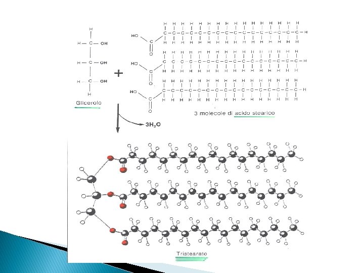Trigliceridi Nei substrati lipidici naturali gli acidi grassi si trovano legati tramite un legame estereo ad altre molecole, quella quantitativamente più rappresentativa è il polialcole glicerolo (1, 2, 3 propan-triolo), ne derivano “triacilgliceroli” o trigliceridi (per completa esterificazione delle funzioni ossidriliche con acidi grassi) “diacilgliceroli” e “monoacilgliceroli”, sono riunibili sotto la denominazione comune di “gliceridi” Mono e di-gliceridi vengono impiegati nell’industria alimentare come emulsionanti in quanto le (o la) code non polari (rappresentate dalle catene alifatiche degli acidi grassi) si legano alla fase lipidica, mentre la parte polare della molecola (rappresentata da uno o due ossidrili), si posizionano verso la fase acquosa]