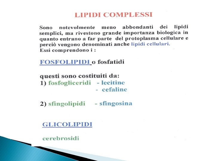 LIPIDI Sono costituiti da una classe di sostanze alquanto eterogenea per cui non esiste una classificazione univoca. Una delle più semplici e razionali li suddivide in i lipidi complessi o saponificabili e semplici o insaponificabili in relazione al fatto che sottoposti a reazione di saponificazione, essi diano origine o meno a più molecole.