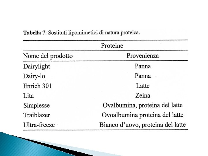 Lipomimetici: proteine Sulle proteine si attua la tecnica della microparticolazione. Le proteine microparticolate sono piuttosto termoresistenti. Le microparticelle sono in grado di dare risposte sensoriali di cremosità, consistenza e rotondità simili a quelle dei grassi. Condizione necessaria per l’utilizzo di tali molecole è un contenuto d’acqua elevato nell’alimento.