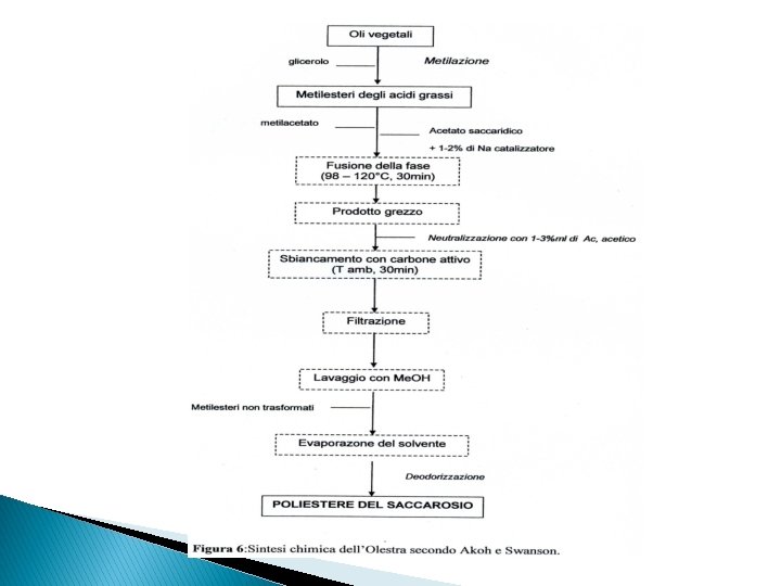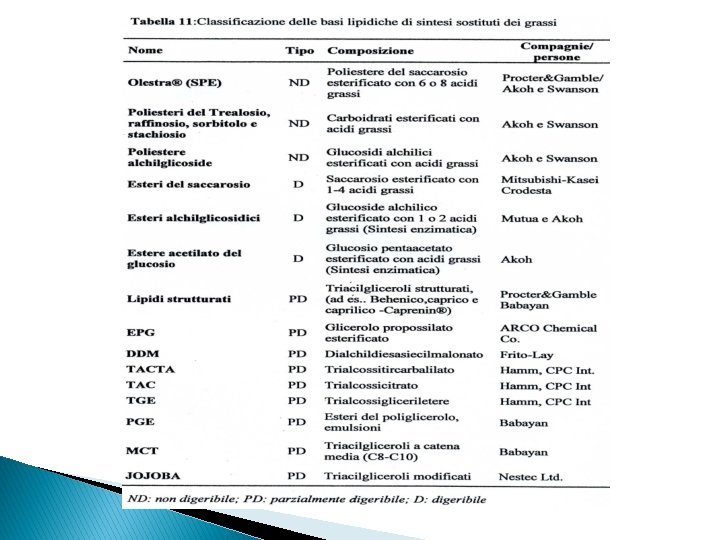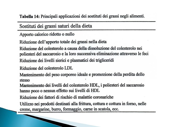 Analoghi dei lipidi Gli MCT contengono C 8 (65 -75%)e C 10 (25%35%). Sono ottenuti da fonti naturali o per sintesi enzimatica Gli SL sono trigliceridi ottenuti per sintesi chimica o enzimatica nella cui molecola coesistono AG a catena lunga e corta. Caprenina: C 6, C 8 e C 22 produce 5 kcal/g Gli esteri degli acidi policarbossilici contengono acidi plicarbossilici esterificati con alcoli alifatici. Sono stati proposti come lipomimetici insieme ai trialcossiglicerileteri